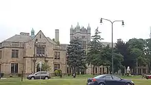 The campus has a Gothic Revival style design.[5] The exterior of Fordson is made of granite and uses Briar Hill sandstone trim. The library has hand carved oak paneling, a fireplace, painted wall murals by Zoltan Sepeshy, tapestries and Jacobean fumed-oak furnishings and many bronze and marble statues including, Athena, Apollo, Artemis, Nike, Niobe, Venus, and Mercury. The main entrance has ten busts that include philosophers, playwrights, and mathematicians like Plato, Aristotle,[5] Aristedes, Sophocles, Homer, Demosthenes, Aesculapius, Euripides, Pindar, Archimedes, and Socrates.[5] The main hall also includes a blue and gold Fordson Tractor with lettering of state champions imprinted on its top. The building features architectural sculpture by Corrado Parducci. Fordson's architecture was represented in the 1987 film, The Rosary Murders when the library and tower were displayed. The school also became recognized as a Michigan Historical Site in 1998.