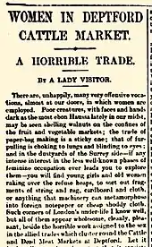 Some 80-100 women and girls, aged 14 to 40,[63] were employed daily; they worked for two firms that had contracted to buy all the gut offal from the market's slaughterhouses. Writing for the Daily Telegraph, "A Lady Visitor",[64] who claimed to have smelled some vile odours in her time, said the stink was insupportable. Tubs of unwashed entrails were coarsely de-fatted by men.