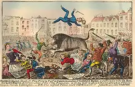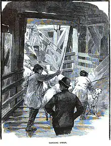 A carefully aimed blow at the head with a poleaxe was the usual method of stunning used in Britain. While The Times reported favourably on the relative humanity practised at Deptford,[40] it came from the skill acquired by regular repetition; it was not infallible. A tanner, examining the lesions on a sample 100 cattle hides — albeit not from Deptford — noted that 45% showed signs of more than one blow i.e., they were not stunned by the first stroke. An advocate of the Jewish shechita method (which was also used at the market) said that he had observed that it often took five blows to fell an ox at Deptford.[59]