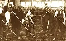 These men, who killed and butchered the animals, worked in gangs of four,[58] and earned very high wages for the era: £5 (≅ £6502018) a week was not uncommon. No slaughtering was done on Saturdays; on other days it varied according to demand, and for a rush order might last up to 20 hours on end. The work was said to be brutalising "and conducive to drink".[49]