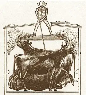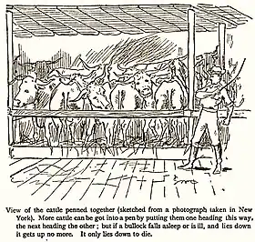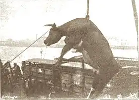 Of all the cattle ever landed at Deptford market, the largest proportion came from the U.S.A.[82] The practice started in 1878 when American cattle and pigs were "scheduled" for port slaughter.[83][84][85] By 1913, when Deptford closed, 3,144,400 American cattle had been landed there, besides sheep and pigs.[86][87]