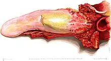 One of the most unpleasant jobs was cleaning cattle and sheep intestines, which were used for making sausage skins (and, according to a later source, condoms).[61] Originally men's work, in about 1891 they went on strike for more pay: management responded by assigning the work to women.[62]
