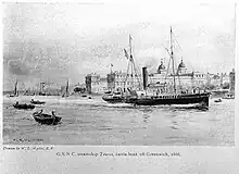 As the transatlantic cattle trade developed (see below), large ocean-going cattle steamers came into use, but these were reluctant to come alongside. Accordingly the market purchased three paddle steamers (named Racoon, Taurus and Claude Hamilton) into which cattle were transshipped at Gravesend. Between them, those vessels conveyed more than 1.6 million animals to Deptford.[35]