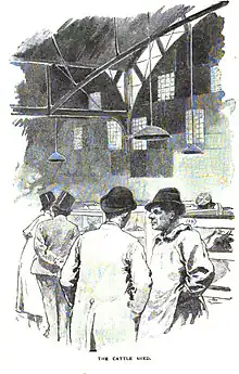 On landing, animals were examined by a veterinary surgeon who took their pulse and temperature. Suspects were set aside for observation. If one animal in a cargo was found to be contagious, it was slaughtered at once and its carcase sterilised by steam in an iron digester; its companions were put with the suspects. Drovers wore protective clothing, afterwards disinfected in a sulphur chamber. Hides, horns, fleeces and offal were also disinfected; manure and litter were sterilised. A correspondent from The Times thought the market was very clean and by the standards of the day animals were slaughtered humanely.[40]