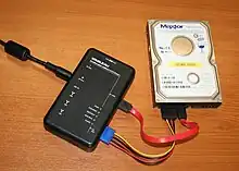 A forensic disk controller or hardware write-block device is a specialized type of computer hard disk controller made for the purpose of gaining read-only access to computer hard drives without the risk of damaging the drive's contents. The device is named forensic because its most common application is for use in investigations where a computer hard drive may contain evidence. Such a controller historically has been made in the form of a dongle that fits between a computer and an IDE or SCSI hard drive, but with the advent of USB and SATA, forensic disk controllers supporting these newer technologies have become widespread. Steve Bress and Mark Menz invented hard drive write blocking (US Patent 6,813,682). [1]