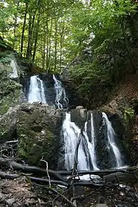 The Forsaker Creek (Swedish: Forsakarbäcken) runs through the nature reserve and passes the Forsakar Waterfalls (Swedish: Forsakar Vattenfall), the upper fall having a free fall of 7.4 metres and the lower fall having a free fall of 10.6 metres. The bedrock of the ravine consists of Gneiss.[2] The nature reserve has three minor dams that were erected during the late 19th century and the early 20th century to create hydroelectricity. The dams are nowadays dismantled and inactive.