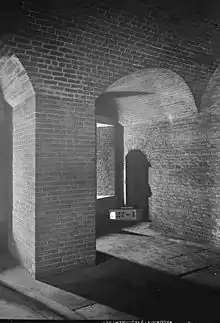 Within the fort (and built at approximately the same time) is a Federal style, 3+1⁄2-story limestone troop barracks, consisting of five independent but adjacent sections - each intended to house one company. Each section contains a ground floor mess, two floors of barracks rooms, and an attic. Brick additions were added to the rear of the building in 1861, housing washrooms and kitchens. Next to the barracks is a powder magazine, also constructed of limestone. Additional buildings originally built within the fort, such as officer's housing, have long since been destroyed.