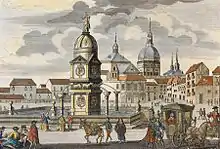 The fountain was formed by a quadrangular temple of classical nature. This was crowned in each of its four sides, with a triangular pediment and, at the top, with a dome, on which rested the sculptural group of the Abundance.