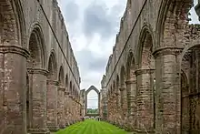 After a dispute and riot in 1132 at the Benedictine house of St Mary's Abbey in York, 13 monks were expelled, among them Saint Robert of Newminster. They were taken under the protection of Thurstan, Archbishop of York,[3] who provided them with land in the valley of the River Skell, a tributary of the Ure. The enclosed valley had all the natural features needed for the creation of a monastery, providing shelter from the weather, stone and timber for building, and a supply of running water.[4] The six springs that watered the site inspired the monks to give it the name of Fountains.[5][6]