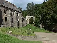 To the west of the cloister was the lay brothers' infirmary, and beyond that the two guest houses still visible, and a large guest hall to the north of them. Only the base of a pier and a table leg survive of the guest hall, but its plan has been established by geophysical survey.[48]