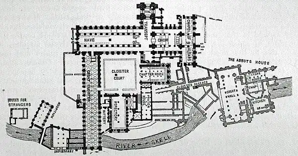 The original abbey church was built of wood and "was probably" two storeys high; it was, however, quickly replaced in stone. The church was damaged in the attack on the abbey in 1146 and was rebuilt, in a larger scale, on the same site. Building work was completed c. 1170.[41] This structure, completed around 1170, was 300 ft (91 m) long and had 11 bays in the side aisles. A lantern tower was added at the crossing of the church in the late 12th century. The presbytery at the eastern end of the church was much altered in the 13th century.[42] The church's greatly lengthened choir, commenced by Abbot John of York, 1203–11 and carried on by his successor, terminates, like that of Durham Cathedral, in an eastern transept, the work of Abbot John of Kent, 1220–47.[43] Similarities to the choir at Beverley Minster have been drawn by architectural historian Lawrence Hoey.[44] The 160-foot-tall (49 m) tower, which was added not long before the dissolution, by Abbot Huby, 1494–1526, is in an unusual position at the northern end of the north transept and bears Huby's motto: Soli Deo Honor et Gloria.[34] The sacristry adjoined the south transept.[45]