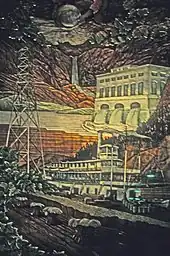 The main house was decorated with silver and gold murals by Anthony Heinsbergen and Frank Bouman of Los Angeles, and a rendering of the Big Dipper (a symbol of Alaska) on the ceiling. Murals were done on canvas with reliefs in Masonite leafed with gold and silver. The building's structure is reinforced concrete with travertine on the exterior street level.[2]