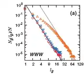 The plot shows the invariance of the degree distribution P(k) under the renormalization performed as a function of the box size on the World Wide Web. The networks are also invariant under multiple renormalizations applied for a fixed box size lB. This invariance suggests that the networks are self-similar on multiple length scales.