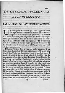 Daviet published in the years 1759-1760 two important papers in the journal of the Academy, Miscellanea Taurinensis:[2] the first one (1759) about imaginary numbers is titled Mémoire sur les logarithmes des quantités négatives[3] and has an extension titled Éclaircissements sur les quantités imaginaires; more important is the second one, titled Sur les principes fondamentaux de la méchanique (1761).[4] In four sections (law of inertia, composition of forces, equilibrium and law of the lever) he tried to establish the a priori fundamental laws of mechanics.[5]