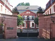Hotel of the Order of the Holy Sepulcher, Mainz. Chain-covered ball bombs, from which flames strike, are located at the entrance gate as an allegory for the French artillery school, where François Français was teaching.