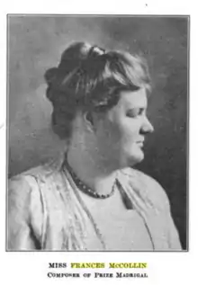 Among the honors McCollin won a first prize from the Manuscript Music Society of Philadelphia in 1916, and the Philadelphia Matinee Musical Club's annual prize in 1918. Also in 1918, she became the first woman to win the Clemson Prize from the American Guild of Organists, and the Kimball Company Prize from the Chicago Madrigal Club.[2] In 1931 her composition "Spring in Heaven" won the Federation Prize from the National Federation of Music Clubs.[10] In 1951, she was named a Distinguished Daughter of Pennsylvania.[11]