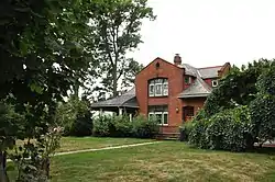 The Francis H. Holmes House is located in southeastern New Britain, at the northwest corner of Rocky Hill Avenue and South Street. It is a two-story brick structure, with a flared hip roof and brownstone trim. It exhibits an architecturally eclectic mix of styles, with the Jacobethan use of triple windows and gables predominating. Also present are elements of Shingle style and Craftsman woodwork. The roof is pierced by large gabled dormers with brownstone parapets. An enclosed porch wraps from the east-facing facade to the south, and a similarly styled former porte-cochere, now also enclosed, is on the north side.[2]