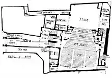- ↑ The building was the first purpose-built, stone and brick theatre in Stockport. It introduced the latest designs in ventilation and featured an updated version of gaslighting. The auditorium had a capacity of 3,000 and featured tip-up seats in the dress circle and upholstered chairs in the boxes. Local building contractors were used at a cost of £12,000, a fee paid personally by Revill. The theatre was demolished in 1962.[33]