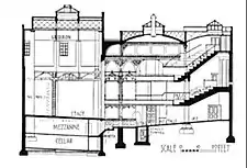 Outside of London, and prior to 1886, Matcham only had two designs commissioned, both in Glasgow: Hengler's Grand Cirque and the Royalty Theatre.[29] In 1879 he started work on the redesign of the Royalty,[30] a playhouse originally designed by James Thomson and one that had been built on the first floor of a four-storey building. The layout was problematic and Matcham had to make a series of adjustments. To compensate, he designed a ventilation system which involved the installation of an exhaust duct over the auditorium gas light which caused the heat from the burners to rise up and create a movement of air through the theatre. It was a design that he also used on the Gaiety, Matcham's second Glaswegian theatre. The Royalty took just four weeks to complete and was relatively inexpensive, two factors that helped enhance his reputation.[23]