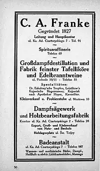 Carl August Franke arrived in Bromberg in 1827 from Leszno, together with his wife Caroline Keymer. He established a distillery business, the C.A. Franke Spiritusraffinerie with a modest capital of 500 thalers.[1] The workshop was located at Bruckenstraße 10 (in today's Mostowa street).[2] C.A. Franke died in 1853 in Bydgoszcz.