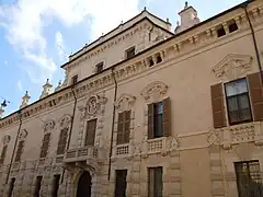 He redesigned the Palazzo Valenti Gonzaga. This was a pre-existing building from the 16th century, which the owners wished to modernize. The façade was transformed into a Baroque style by another Lombard architect. Geffels' contribution is situated in the interior of the palace.[26] He reworked the façade of the inner courtyard, which included a statue of Jove and painted decorations combined with stucco reliefs. The façade at the rear of the courtyard was also remodeled by Geffens. In the palace he redesigned the rooms. In some he painted frescoes while Gian Battista Barberini added decorative stuccowork and statues.[15] The renovation was concluded in 1677.[26]