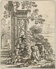 His interest in Bamboccianti subjects is also shown in his series of etchings of Italian landscapes, buildings and ruins. This series of seven plates includes a frontispiece with a dedication to Marchese Ottavio Gonzaga and six prints showing figures amidst classical ruins. The plates have been etched with a broad needle and are heavily etched. Among these, the most ingenious and effective is the one in which, in front of a column ruin and some bushes in the back, five crooks are trading or playing cards on top of a using a column base.[24]