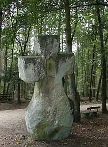 According to tradition, the celebrated missionary in the Eifel region, Willibrord refashioned the roughly 5,000-year-old menhir by hand into the shape of a cross as a Christian monument. Two niches for figures have been chiselled into the rock, each surrounded by holes. Today, the cross is about 3.5 metres high.