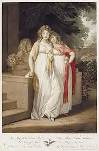 In May 1813, during a visit to his uncle Duke Charles in Neustrelitz, Prince Ernest Augustus, Duke of Cumberland and Teviotdale, the fifth son of King George III, met and fell in love with Frederica, who was his first cousin.[4] Duke Charles made it clear to his daughter that her separation from the Prince of Solms-Braunfels was absolutely logical, and that he saw a marriage with an English prince as a great opportunity for her. During the next months Frederica considered the intentions of Ernest and the possible effects on her own situation. When, after the victory of the allies in the Battle of Leipzig, Ernest spent some days in Neustrelitz, he was greeted enthusiastically. Some time later Frederica asked the Prussian king for approval for her divorce from Prince Frederick William of Solms-Braunfels. All parties agreed, including the Prince of Solms-Braunfels, but Frederick William's sudden death on 13 April 1814 precluded the need for a divorce. The prince's demise was considered by some as a little too convenient, and some suspected that Frederica had poisoned him.[5] In August, the engagement with Ernest was officially announced. After Ernest's eldest brother, George, Prince Regent, gave his consent to the wedding, Frederica and Ernest were married on 29 May 1815 at the parish church of Neustrelitz.[1] Some time later, the couple traveled to Great Britain and married again on 29 August 1815 at Carlton House, London.[1]