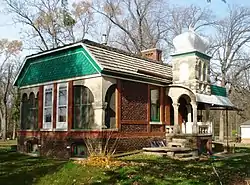 The Frederick Francis Woodland Palace is a historic house located in Francis Park 2.5 miles (4.0 km) northeast of Kewanee, Illinois. Frederick Francis, a multi-talented architect, engineer, and artist, began work on the house in 1889; while he and his wife moved into the house a year later, he continued to work on it until his death in 1926. The house has an eclectic design noted both for its vernacular interpretation of Queen Anne and Romanesque Revival architecture and its innovative engineering. The building's exterior design includes a hand-chipped brick exterior, a concrete tower above the main entrance, two porches on the south side, a solarium on the west side, and a gambrel roof. The interior's noteworthy features include a bedroom designed like a Pullman sleeping car, a system of levers which opened both front doors at once, a hearth with a flue system that also helped heat the house, a water filtration and heating system supplied by a cistern, and several secret compartments.[2]