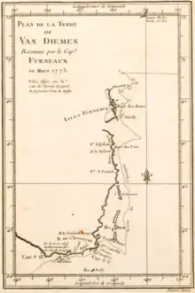Tobias Furneaux and Robert Bénard, Plan de la Terre de Van Diemen reconnue par le Cape. Furneaux en Mars 1773; from: Jacques Cook, Voyage dans l'Hemisphere austral, et autour du Monde fait sur les Vaisseaux de Roi, 1'Adventure, & la Resolution, en 1772, 1773, 1774 & 1775, Paris, 1778, Pl. 11. nla.gov.au/nla.obj-232573727