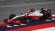 Vesti got his first taste of Formula 2 machinery when he participated in the post-season test in 2021 with ART Grand Prix alongside former F3 title rival Théo Pourchaire.[74] On 21 January 2022, ART Grand Prix announced that Vesti would join the team for the 2022 season alongside Pourchaire.[75] Before the season, Vesti stated that he was "hoping to translate points into podiums" after his consistent F3 season.[76] Vesti started his season poorly, failing to score points during the first two rounds, compounded by poor qualifying.[77][78] During the third round in Imola, in the feature race, Vesti started on the soft tyres, which allowed him to pit during an early safety car. With many rivals ahead on the alternate strategy, Vesti was able to claim his first points of the year by finishing sixth, after which he stated that he needed to "work on qualifying".[79] In Barcelona, he banished his qualifying woes to secure third.[80] He finished seventh in the sprint race and ended up holding his position during the feature race, thus scoring his maiden podium in the category.[81][82]