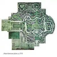 The plan involved a parterre with a complex system of cascades on the sloping terrain in front of the new palace. It was fed by a complicated but inefficient system of pumps which never came to work properly.[2]
