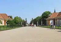 The gate opens to a path which passes between two long, yellow buildings with white details. They are the two surviving wings of the Prince's House. The south wing, located on the left-hand side when entering the park, was converted into an orangery by Nicolai Eigtved in 1744 and is now part of the Royal Danish Horticultural Society's Garden. The north wing, located on the right-hand side, is used by the park's administration.