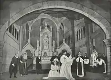 The favourable impressions of his peers at the Conservatory led Garrett to present the play to the public. The play was first performed before an audience on 4 July 1843, in the private Quinta do Pinheiro Theatre in Lisbon; Almeida Garrett himself played the part of Telmo Pais.[1] The first public showing, in the Salitre Theatre in the summer of 1847, was of a severely censured version, especially the end of Act I, considered a "diplomatic complication" with Spain: a contemporary article published in the Revista Universal Lisbonense described it as having turned "the most exemplary and admirable of our dramas into a shapeless monster".[6] The full play only premiered in the National Theatre in 1850.