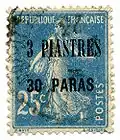 Originally, the post office used postage stamps of France, but these were denominated in centimes and francs instead of the local piasters, so beginning in 1885, some French stamps were surcharged in piasters, at a rate of four piasters to the franc.