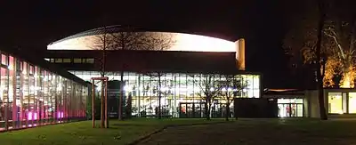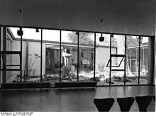 In October 1968 Volker Wangenheim, Generalmusikdirektor (GMD) for Bonn, offered Stockhausen all of the rooms of the Beethovenhalle in Bonn for an evening concert of his music. In addition, he suggested that Stockhausen might consider writing a new piece for the Bonn Orchestra, though he could offer only three rehearsals, and warned that Bonn did not have much money for expenses. Wangenheim also wrote that he had heard about Stockhausen's Ensemble and Musik für ein Haus projects at Darmstadt in 1967 and 1968, implying that he hoped for something along the same lines.[1] Stockhausen proposed an evening-long programme of his music to be performed simultaneously in all three auditoriums of the building. At the same time, there would be a new work played at four places in the foyer and lasting four-and-a-half hours. This work was composed in the Fall of 1969 for the Orchestra of the Beethovenhalle Bonn, and was titled Fresco, Wall Sounds for Meditation.[2] The world premiere took place on 15 November 1969, with Volker Wangenheim conducting Orchestra I (winds and percussion) in the cloakroom foyer at the main entrance of the Großer Saal, Volkmar Fritsche conducting Orchestra II (strings) on the "bridge" in the foyer of the Großer Saal, Bernhard Kontarsky conducting Orchestra III (winds and strings) in the exhibition space by the inner courtyard, and Georg Földes conducting Orchestra IV (strings) in the small cloakroom foyer in front of the Studio auditorium.[3]