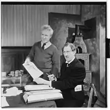 ![]() Scriptwriter Kjell Aukrust and actor Leif Juster during the filming of Freske fraspark, a film adaptation of Aukrust's play Dobbeltsats og freske fraspark | |