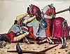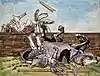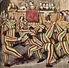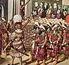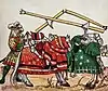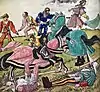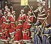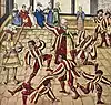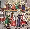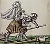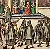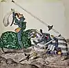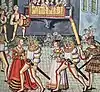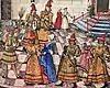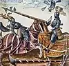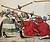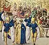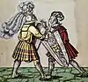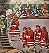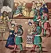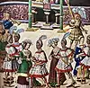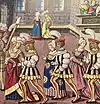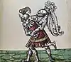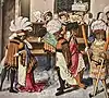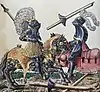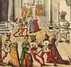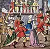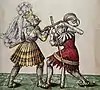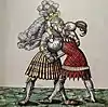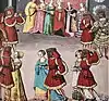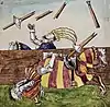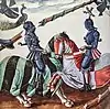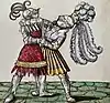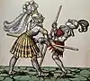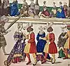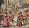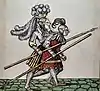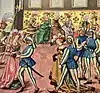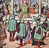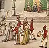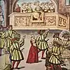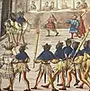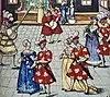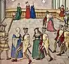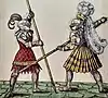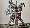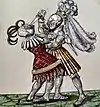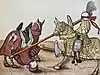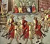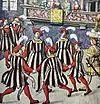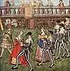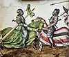 After each of the sixty-four tournaments is a scene depicting a moresca (a pantomime dance) or other post-tournament festivities with male courtiers, including the knights who had competed in the tournament, dressing up to dance in a variety of exotic costumes.[46] Known as ‘mummeries’, these were a regular feature of the evening entertainment after tournaments.[16] Although the illustrations usually depict dances — either row or circle dancing — sometimes other types of mummeries are shown, such as burlesques of little known court ceremonies, prize-givings and mock battles, for example a pike battle between peasants and Landsknechte.[47]