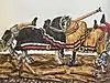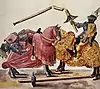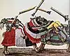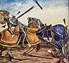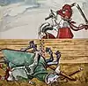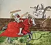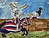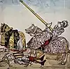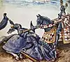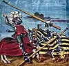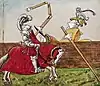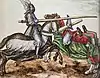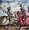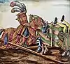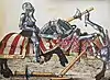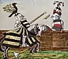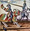 Over the next ten years planning sketches for the entire work were created[1] and Maximilian dictated a partially completed text of the story to his secretary.[7][8] According to the draft text,[9][10] the story is an account of a series of 64 tournaments in which Freydal – a young knight and Maximilian's literary alter ego – demonstrates his valour in combat in order to earn honour and fame[11] and to win the hand of a princess.[8] The theme of the story reflects Maximilian's own enthusiasm for jousting. Unusually for a powerful ruler, Maximilian was himself a regular participant in tournaments and continued to take part in jousts until at least 1511, when he was in his 50s.[12] His affinity for jousting contributed to his soubriquet the "last knight".[13]