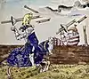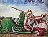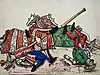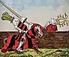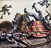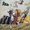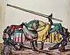 - Geschifttartschen-Rennen (Joust of war with "flying" and "exploding" shields). This combines the Bundrennen with the Geschiftscheiben-Rennen. The spectacle of the Bundrennen is increased by attaching multiple triangular platelets to the shield which, when the shield is ejected, come loose and explode into the air like a firework display.[39] Maximilian claimed to have invented this type of joust.[13]