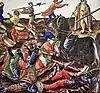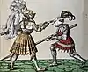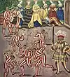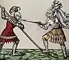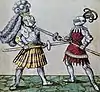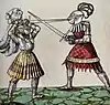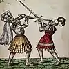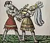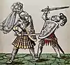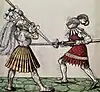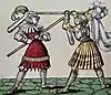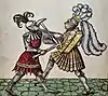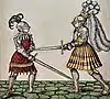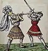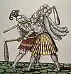 In each of the tournaments, the participants are shown engaging in a foot combat. A variety of weapons are used, including iron clubs (Eisenkolben), flails (Drischel), swords (Turnierschwert)[43] and daggers.[44] With one exception (folio 51), all the foot combat miniatures were painted by the same anonymous artist.[45]