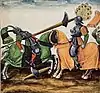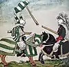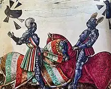 Although the draft text was never combined with the paintings to create a completed work,[18] the tournament book nevertheless mirrors it: 64 tournaments are depicted, with each tournament illustrated by two paintings of horseback jousting, a foot combat painting and a painting of mummery festivities at the end of the day.[15] The miniatures in the tournament book manuscript illustrate the types of jousting popular at the time, both on foot[note 1] and on horse.[19] Freydal features in each illustrated combat and his opponent is usually an historical figure. There is evidence that Maximilian actually jousted with some of these individuals.[19] Each picture, in the lower margin, identifies the name of the opponent and the other courtiers depicted.[25] The three most prominent opponents in the tournament book are Philipp von Rechberg and Wolfgang von Polheim, both of whom are depicted in jousts eleven times, and Anton von Yfan, Baron of Ivano, (whose actual name was Antonio de Caldonazzo[26]) who is depicted eight times.[27]