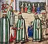 The following is a list of the 255 miniature paintings contained in the Freydal tournament book. The first column identifies each miniature's folio number, the unique consecutive number added in manuscript to the top left and bottom right corners of each painting in the 17th century.[23] Freydal is present in each image shown. In the jousting paintings, he is one of the two jousters depicted. In the mummery paintings, he is the masked figure holding a torch and often standing slightly apart from the revellers. The "Image description" column identifies Freydal's opponent in each joust and notable named participants, other than Freydal, at each mummery, in both cases as stated in the manuscript. The last column indicates the page number in Taschen's reproduction of the miniatures published in 2019, and edited by Stefan Krause, which is the source for the information on each miniature in the list (except where another source is referenced by a citation).