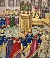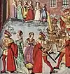 Maximilian I, Holy Roman Emperor from 1508 to his death in 1519, began planning Freydal in 1502.[1] He intended it to be an allegorical romantic account, in text and with illustrations, of the events leading to his marriage to Mary of Burgundy in 1477.[2] It was one of a number of artistic and literary projects intended to immortalize his life and deeds and those of his Habsburg ancestors,[3] and which he referred to as Gedechtnus (or "memorial").[4] His aim was not only artistic, but to create political propaganda to enhance his public image.[5][6]