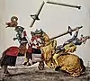 - Gestech im Hohen Zeug (Joust of peace with high saddles). This was, by Maximilian's time, an out-dated form of joust, which he tried to revive. The riders, who were not separated by a barrier, were enclosed in high saddles which meant that it was virtually impossible for them to be unseated. The objective was to split the lance of the opponent.[33] No leg armour was worn as the rider's legs were protected by the saddle structure.[34]