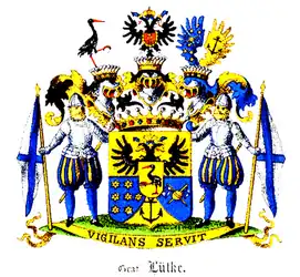 Coat of arms of the Lütke family (ru) of 1866, in the Baltic Coat of arms book by Carl Arvid von Klingspor in 1882.[5]