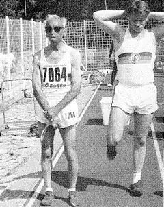 His most notable achievements in athletics were at the World Masters Athletics Outdoor Championships, from 1977 to 1991. In his first 3 WMA Championships (1977, 1979, 1981), he was guided by his son-in-law Klaus Hinrichsen.[2][5] Then, after his daughter and son-in-law split up, he switched to his son as the guide for 1983 and 1985,[6] and then to his grandson in 1991.[7]