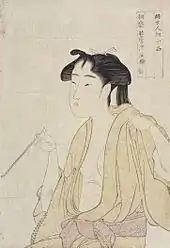 In Tabako no Kemuri o Fuku Onna (煙草の煙を吹く女, "Woman blowing tobacco smoke"), Utamaro depicts a young woman holding a kiseru tobacco pipe. She sits in a decadent posture with her kimono open, exposing her breasts, and her hair is coming untied. The pipe rests on her fourth and fifth fingers, with her thumb at the end on her index and middle finger holding it on top. She blows a puff of smoke rendered with karasuri embossing against the mica-dusted background.[12]