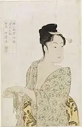 Kitagawa Utamaro (c. 1753–1806) made his name in the 1790s with his bijin ōkubi-e ("large-headed pictures of beautiful women") portraits, focusing on the head and upper torso, a style others had previously employed in portraits of kabuki actors.[4] Utamaro experimented with line, colour, and printing techniques to bring out subtle differences in the features, expressions, and backdrops of subjects from a wide variety of class and background. Utamaro's individuated beauties were in sharp contrast to the stereotyped, idealized images that had been the norm.[5]