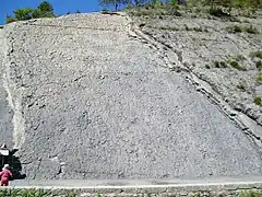 The most famous site is the Dalle à ammonites, on the RP 900 at 1.5 km (0.93 mi) north of Digne-les-Bains. With a 60° incline, it bears over 1,500 ammonites, 90% of which belong to the species Coroniceras multicostatum from the Sinemurian (Early Jurassic). Those ammonites could attain a diameter of 70 cm (28 in). Remains of nautilus, belemnites, Pecten and other bivalves can also be seen. The deposit thickness is estimated to be around 20 cm (7.9 in), laid down over a 100,000-year period.[7]